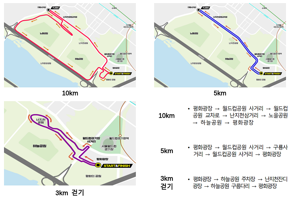 이에 행사 당일인 4일(토) 오전 8시 50분부터 10시 20분까지 월드컵공원 평화광장 입구~구룡사거리~월드컵대교 등 마라톤 주요 구간의 단계별 교통통제가 이뤄질 예정이다.