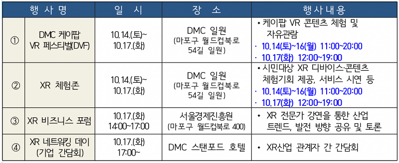 「서울XR 페스티벌」은 ▲ 케이팝과 연계한 가상현실(VR) 콘텐츠 체험 ▲ 확장현실(XR)기업의 제품 전시와 체험 ▲ 확장현실(XR) 산업 관계자 간 지식 공유를 위한 「XR 비즈니스 포럼」▲ 확장현실(XR) 기업 애로사항 등 청취를 위한「XR 네트워킹 데이」등 4개 행사로 구성되어, DMC 일대, 서울경제진흥원 SBA홀, 스탠포드 호텔 등에서 진행된다.