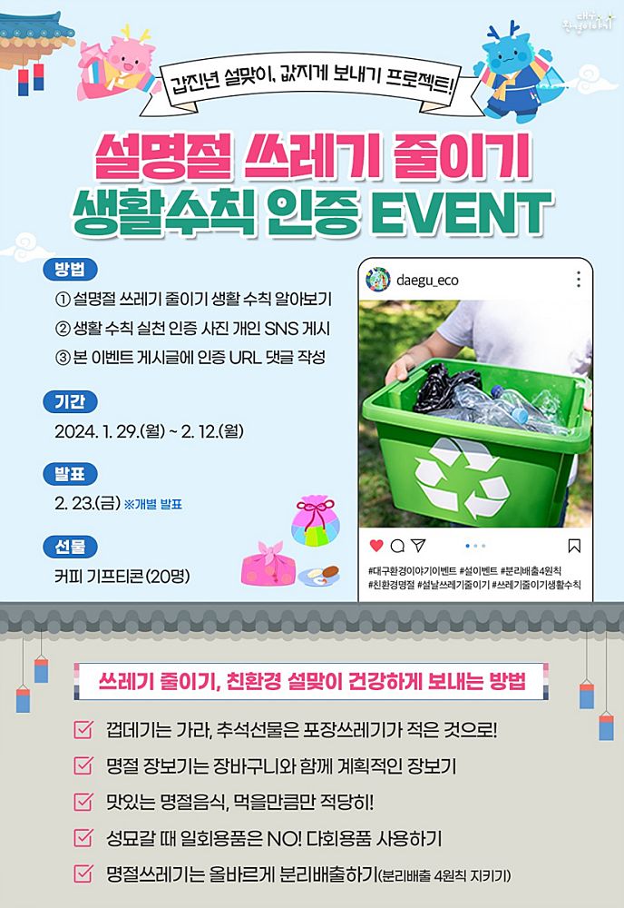 설 연휴 기간 쓰레기 줄이기 생활수칙은 ▲껍데기는 가라, 추석 선물은 포장 쓰레기가 적은 것으로! ▲명절 장보기는 장바구니와 함께 계획적인 장보기 ▲맛있는 명절 음식, 먹을 만큼만 적당히! ▲성묘 갈 때 일회용품은 NO, 다회용품 사용하기 ▲명절 쓰레기는 올바르게 분리배출하기(분리배출 4원칙 지키기) 등이다.