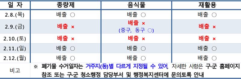 이번 연휴에는 설 당일(2.10.), 일요일(2.11.)에는 쓰레기를 수거하지 않기 때문에, 9일(금) 및 10일(토)에는 쓰레기를 배출하지 않도록 시민들의 협조가 필요하다.