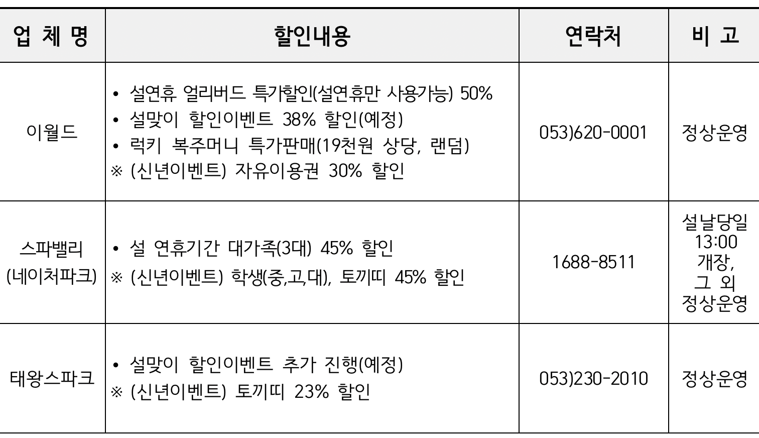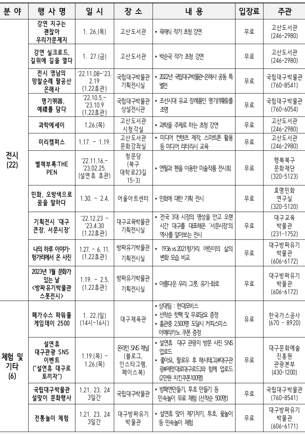 특히, 이번 설 연휴에는 시 소관 문화시설(대구미술관, 근대역사박물관 등)을 22일(일) 설 당일만 휴관하도록 하고, 이벤트로 치킨 쿠폰 및 관광기념품 증정과 할인 혜택 등을 선보일 예정이다.