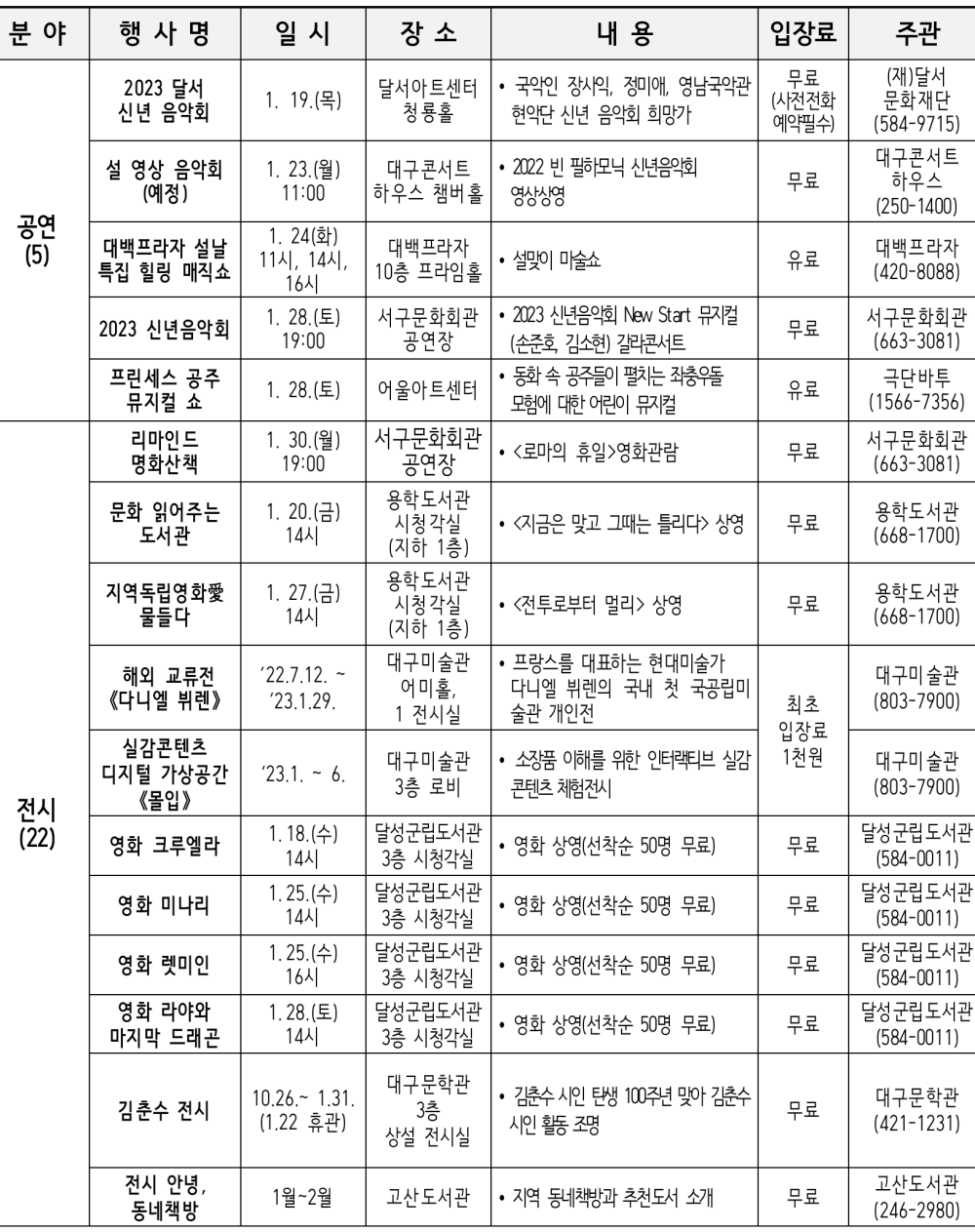 먼저, 공연 분야는 계묘년 새해를 맞이해 ▲달서아트센터에서는 국악인 장사익, 지역 출신 가수 정미애 등이 함께하는 ‘2023 달서 신년 음악회’가 1. 19.(목)에 열리고, ▲세계적인 오케스트라 빈필하모닉의 ‘2022 신년음악회’ 를 1. 23.(월) 대구콘서트하우스 챔버홀에서 영상음악회 형식으로 선보인다.