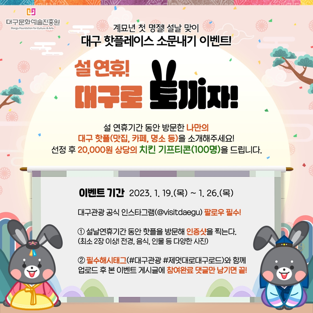 두 번째로 대구관광 공식 SNS 채널 인스타그램(@visitdaegu) 채널을 통해 1월 19일(목)부터 1월 26일(목)까지 설 연휴 맞이 대구의 핫플레이스와 식당 등 지역에 대한 소문내기 이벤트로 참여하는 “설 연휴! 대구로 토끼!자!” 이벤트가 진행된다.