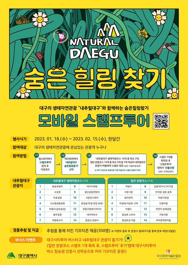첫 번째로 1월 18일(수)부터 2월 15일(수)까지 대구에 숨겨진 생태 자원을 관광하며 일상에 지친 마음을 힐링하고, 선물도 받을 수 있는 “내추럴대구 숨은 힐링 찾기 스탬프 투어”를 진행한다.