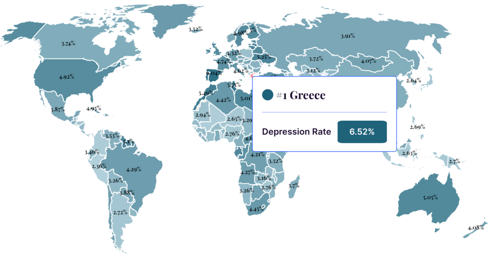 미국의 통계사이트 와이즈보터(Wisevoter)에 의하면 세계에서 가장 우울한 나라, 다시말해 우울증 비율이 가장 높은 나라 1위는 그리스(Greece)가 차지했다. 그리스의 우울증 비율은 6.52%로 나타났다.