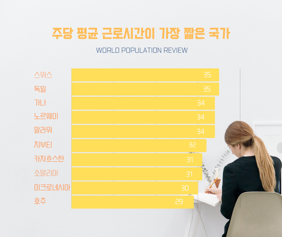 반면에 주당 평균 근로시간이 가장 짧은 국가 1위는 호주(Australia)가 차지했다. 호주의 근로자들은 주당 평균 29시간을 일하는 것으로 나타났다. 현재 호주와 스페인, 스코틀랜드 등 몇몇 국가에서는 주 4일제 시범 시행을 진행중이기도 하다.