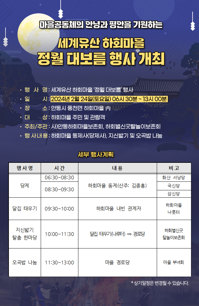 사단법인 안동하회마을보존회와 사단법인 하회별신굿탈놀이보존회는 오는 2월 24일(토) 세계유산 하회마을에서 정월대보름 행사를 공동 개최한다.