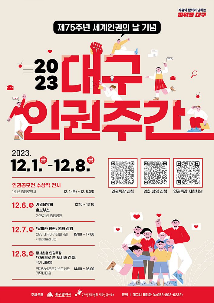 대구광역시는 세계인권선언(1948년 12월 10일) 75주년을 맞아 12월 1일부터 8일까지 국가인권위원회 대구인권사무소와 함께 2.28기념 중앙공원 등 동성로 일대에서 ‘2023 대구인권주간’ 행사를 개최한다.