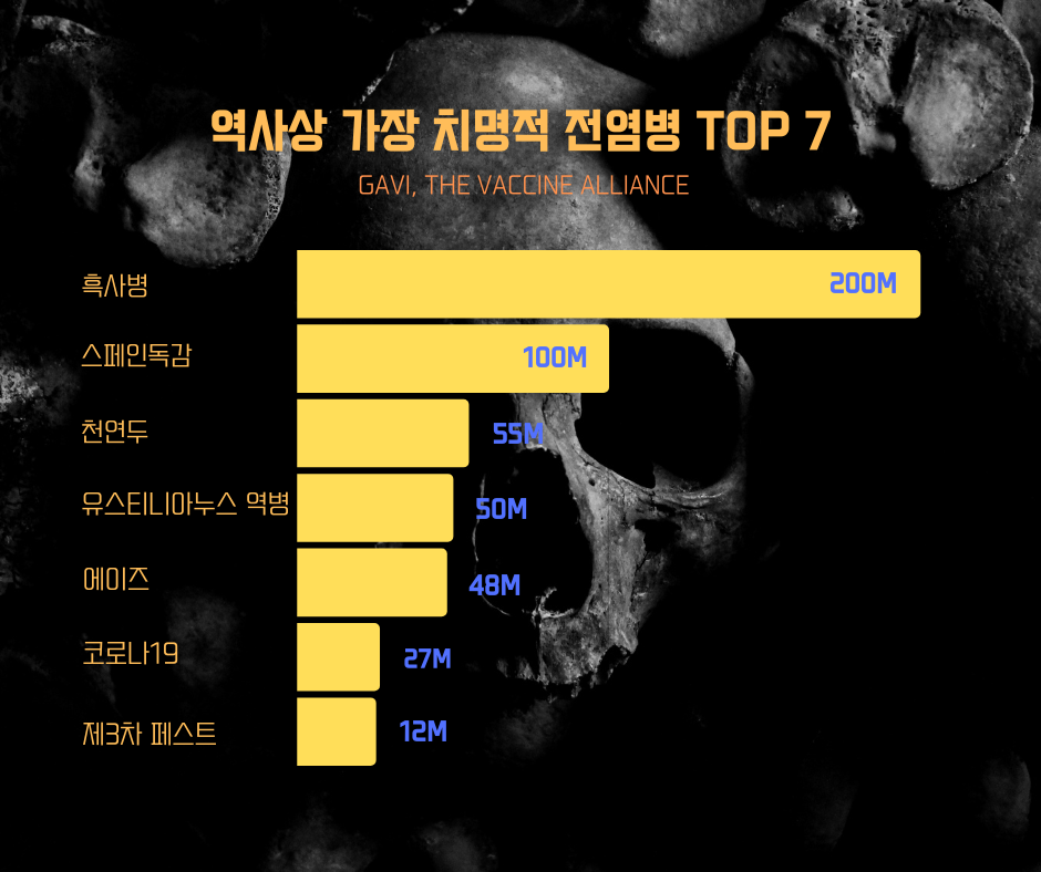 개발도상국에 백신에 대한 접근성을 높이기 위해 설립된 세계백신면역연합(Gavi, The Vaccine Alliance)에 따르면 세계 역사상 가장 많은 사망자가 발생한 전염병 1위는 흑사병(Black Death)으로 최소 7,500만에서 최대 2억명이 사망했을 것으로 추정했다. 1334년부터 1353년까지 유럽 전역을 휩쓴 대재앙은 중세 유럽을 공포로 몰아 넣으며 경제·사회·문화 등 모든 방면에 막대한 영향을 끼쳤다.