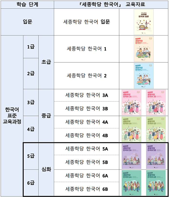 세종학당재단(이사장 이해영, 이하 재단)은 고급 수준의 한국어 의사소통을 위한 심화 교육과정「세종학당 한국어(5A~6B)」교재와 온라인 강좌를 개발해 ‘누리 세종학당*(https://nuri.iksi.or.kr/)’과 ‘온라인 세종학당**(https://www.iksi.or.k)’에 공개했다.