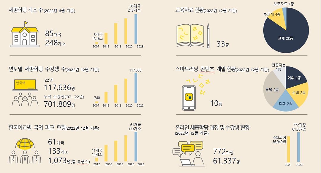 방탄소년단(BTS), ‘오징어게임’ 등 K-팝과 K-드라마로 대표되는 K-컬처의 인기가 아시아를 넘어 유럽, 중동, 남미 등 세계로 확산되고 있다. K-컬처의 확산은 한국어 학습의 강한 동기로도 작용해 한국어 학습 수요를 견인하고 있다. 2007년 740명에 불과했던 세종학당 수강생은 2022년 처음으로 11만 명을 돌파했다. 또한 디지털 네이티브가 생산과 소비의 주체로 부상하고 있는 가운데 메타버스, 생성형 인공지능(AI)과 같은 디지털 기술은 언어를 더욱 쉽고 효과적으로 학습할 수 있는 환경을 제공하고 있다.