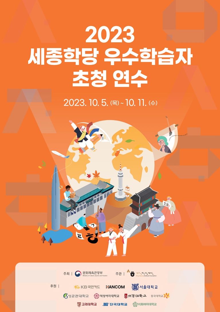 세종학당재단(이하 재단)은 문화체육관광부(장관 박보균, 이하 문체부)와 함께 제577돌 한글날을 기념하는 한글 주간(10.4.~10.10.)을 맞아 10월 5일(목)부터 11일(수)까지 ‘2023 세종학당 우수학습자 초청 연수’를 개최한다.