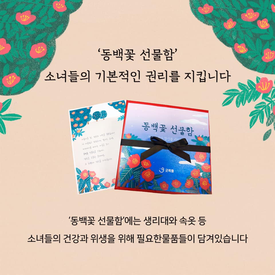 동백꽃 선물함 캠페인은 국제구호개발 NGO 굿피플에서 진행하는 저소득층 여학생들에게 위생 용품을 지원하는 사업으로, 동백꽃 선물함은 위생 용품, 화장품, 마스크, 영양제 등 10여 종으로 구성되어 있다.