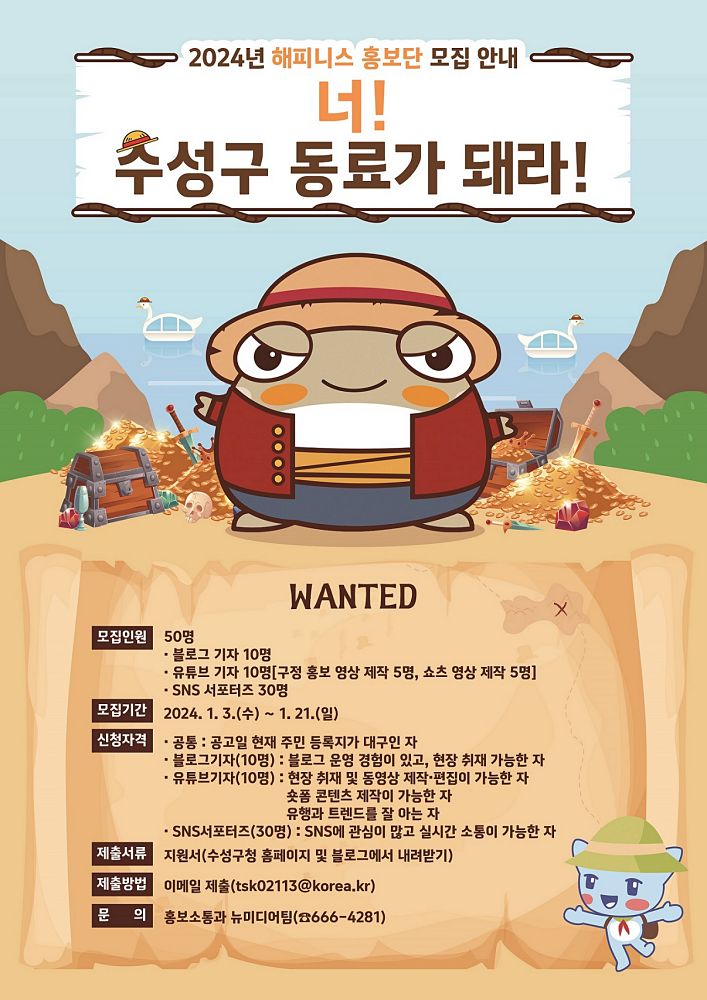 수성구에 애정이 있는 대구 시민 중 현장 취재 및 영상 편집이 가능하거나 SNS 활동이 활발한 사람이면 누구나 지원할 수 있다. 모집 분야는 블로그 기자 10명, 유튜브 기자 10명(구정 홍보 영상 제작 5명, 쇼츠 영상 제작 5명), SNS 서포터즈 30명으로 총 50명을 모집한다.