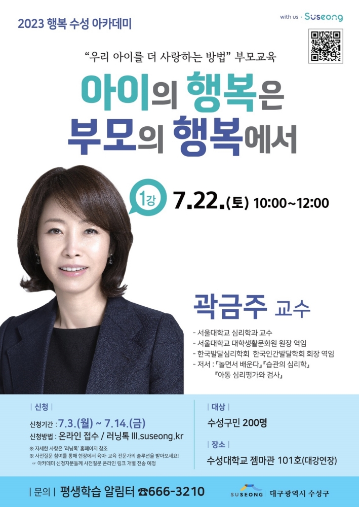 대구 수성구가 수성구민 200여 명을 대상으로 육아·교육 관련 전문가와 함께하는‘2023 행복 수성 아카데미’를 운영한다.
