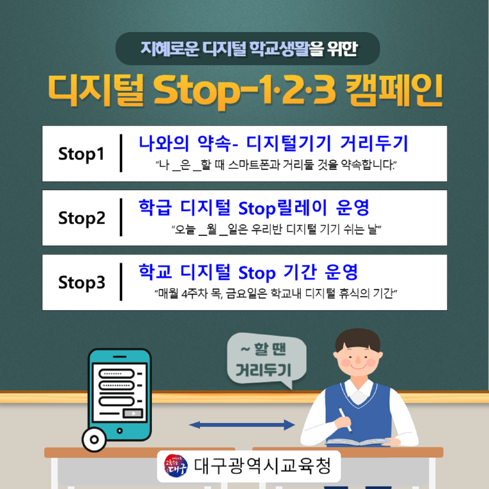 대구시교육청은 정보화기기에 대한 학생들의 자기관리 능력 함양과 주도적인 사용 능력 제고를 위해 ‘지혜로운 디지털 학교생활을 위한 2023. 「디지털 Stop-1‧2‧3 캠페인」’을 전개한다고 17일 밝혔다.