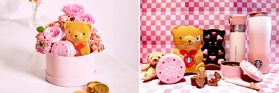 스타벅스는 매장에서 ‘비마인 베어 초콜릿’ 또는 ‘하트 파베 초콜릿’과 함께 텀블러, 머그 등 MD 상품을 구매 시 밸런타인데이 전용 포장 박스를 증정한다. 밸런타인데이를 맞아 출시한 사랑스러운 핑크 컬러가 돋보이는 ‘SS 인디핑크 스탠리 테리 텀블러 473ml’와 ‘SS 핑크 그러데이션 콩코드 텀블러 591ml’ 등의 상품과 함께 구성하면 선물로 제격이다.