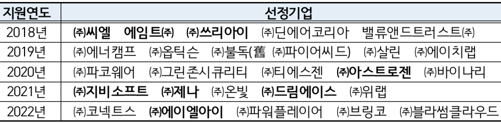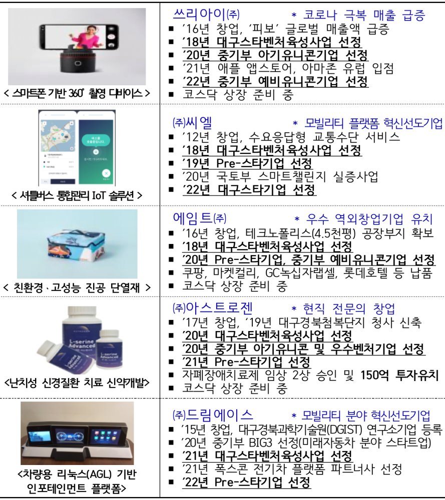 지난해까지 총 25개사를 선정·지원했으며, (주)쓰리아이, 에임트(주), (주)아스트로젠은 스타벤처육성사업을 거쳐 중기부 K-유니콘기업으로 선정되는 등 지역 대표 혁신창업기업으로 성장 중이다.