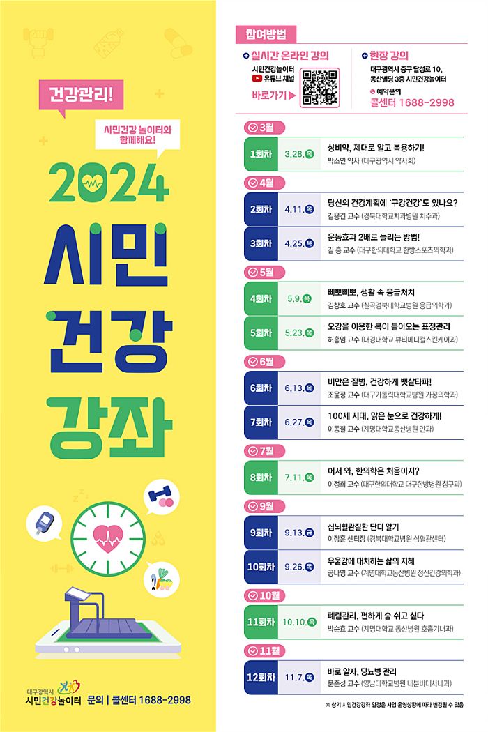 대구광역시 시민건강놀이터는 건강관리의 중요성을 알리고 시민들의 건강관리 역량강화를 위해 2024년 시민건강강좌를 3월 28일(목)부터 시민건강놀이터 건강콘서트홀에서 연간 12회에 걸쳐 개최한다.