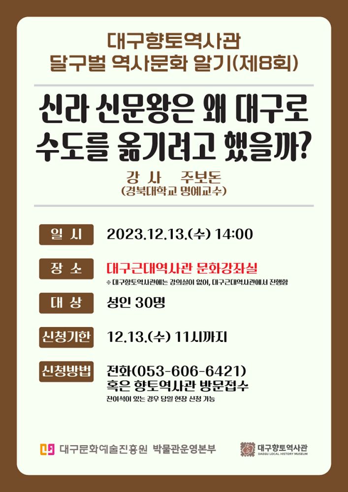 대구문화예술진흥원 박물관운영본부 소속 대구향토역사관은 12월 13일(수) 2시에 신문왕의 달구벌 천도 시도를 통해 신라시대 대구의 위상과 대구 고대사를 이해하는 제8회 달구벌 역사문화 알기 행사를 개최한다.