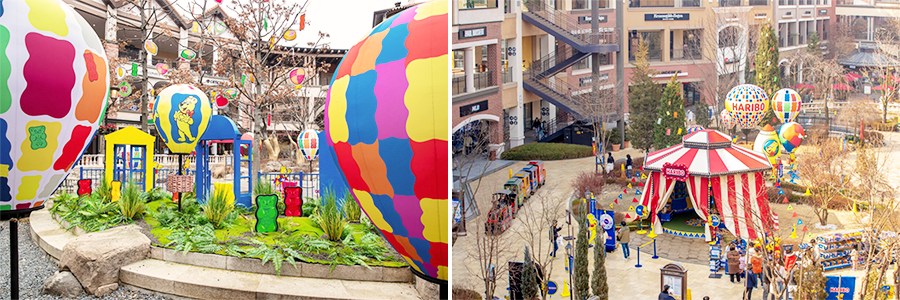 부산 프리미엄 아울렛은 분수광장 일대에 대형 하리보 마스코트인 골드베렌의 조형물과 다채로운 모양의 젤리로 꾸며진 블루밍 가든을 선보인다. 하리보를 상징하는 파란색 정원을 배경으로 노란,빨간색의 장식이 더해서 형형색색의 봄의 감성을 자아낸다.