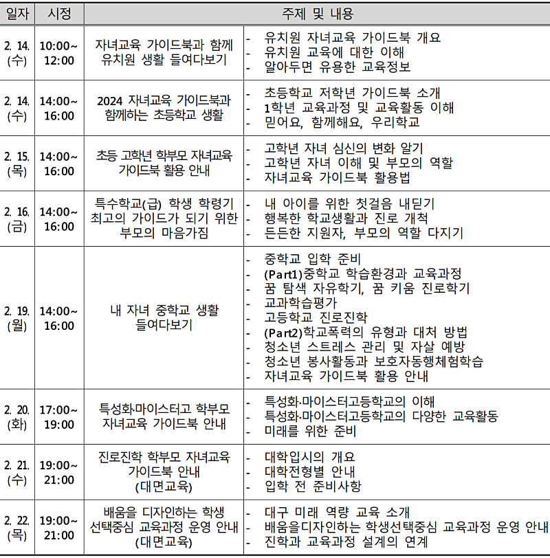 먼저, 화상회의 프로그램인 줌(Zoom)을 활용한 온라인교육은 2월 14일(수) ▲자녀교육 가이드북과 함께 유치원 생활 들여다보기, ▲2024 자녀교육 가이드북과 함께하는 초등학교 생활을 시작으로, 15일(목) ▲초등 고학년 학부모 자녀교육 가이드북 활용 안내, 16일(금) ▲특수학교(급) 학생 학령기 최고의 가이드가 되기 위한 부모의 마음가짐, 19일(월) ▲내 자녀 중학교 생활 들여다보기, 20일(화) ▲특성화ㆍ마이스터고 학부모 자녀교육 가이드북 안내를 주제로 진행된다.