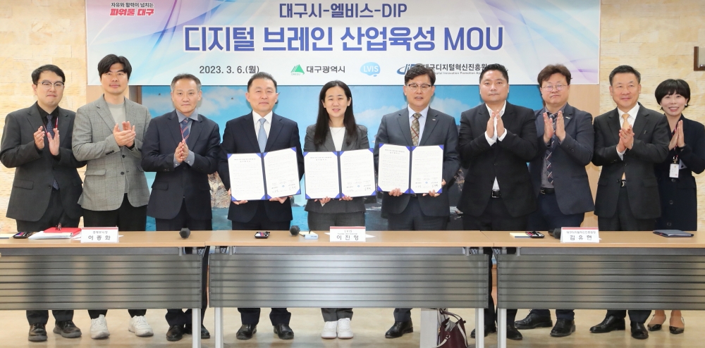 대구시는 3월 6일(월) 산격청사에서 이종화 경제부시장과 엘비스(LVIS) 이진형 대표, 대구디지털혁신진흥원(이하 DIP) 김유현 원장이 참석한 가운데 디지털 브레인 산업 육성 업무협약을 체결했다.