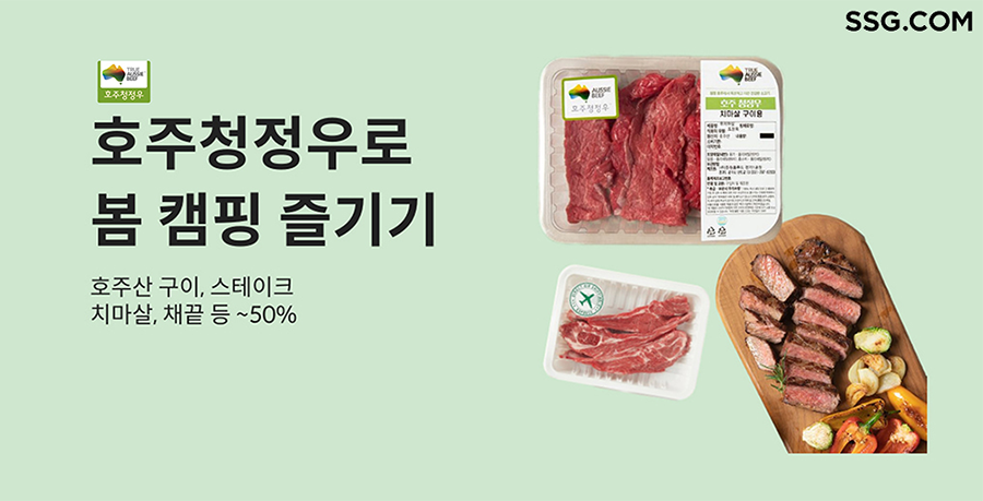 대표 상품으로 ‘호주청정우 채끝 스테이크 300g’을 50% 할인한 9,450원에, ‘와규 바로구이 400g’을 50% 할인한 1만 3,250원에 판매한다. ‘호주청정우 안심 스테이크 300g’은 40% 할인한 1만 4,940원에, ‘호주청정우 부채살 구이 300g’은 40% 할인한 8,880원에, ‘블랙앵거스 꾸리살 샤브샤브 300g’을 40% 할인한 7,920원에 선보인다.