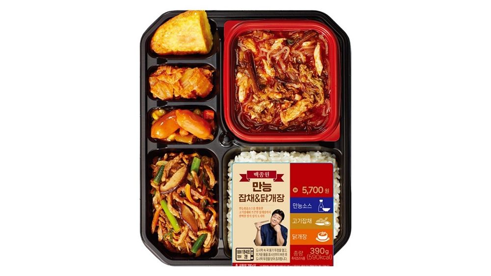 백종원 만능잡채&닭개장 도시락(5,600원)은 만능 볶음 소스로 만든 고기 잡채와 얼큰한 닭개장을 함께 먹는 한식 정식 도시락이다. 뜨거운 물만 부으면 완성되는 닭개장 국물이 포함되어 있어 따뜻한 한 끼를 책임진다.