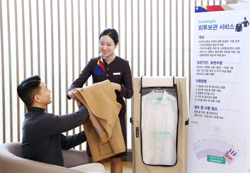 「외투 보관 서비스」 이용을 원하는 고객은 인천국제공항 제 1여객터미널 지하 1층 동편 끝에 위치한 ‘런드리고(운영시간: 6시 ~ 21시)’에서 아시아나항공 탑승권(웹/모바일 포함)을 제시한 후 외투를 맡기면 된다. 1인당 1벌에 한해 최장 5일간 무료 보관이 가능하며, 보관 기간 연장 시 추가 요금이 발생한다.