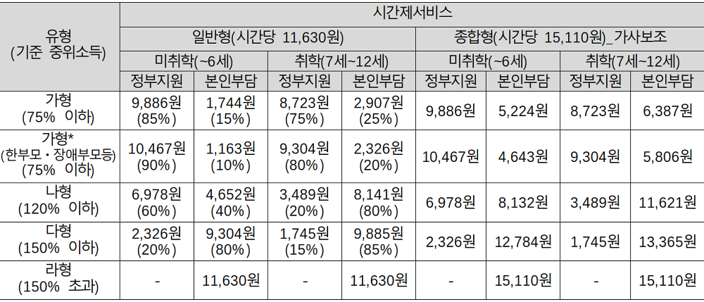 올해부터 자녀 양육비 부담을 경감하기 위해 2자녀 이상 다자녀 가구의 본인부담금 10%를 추가 지원하고, 0~1세 아동을 양육하는 24세 이하 청소년(한)부모(중위소득 150% 이하*)는 이용요금의 10%만 부담하면 된다.