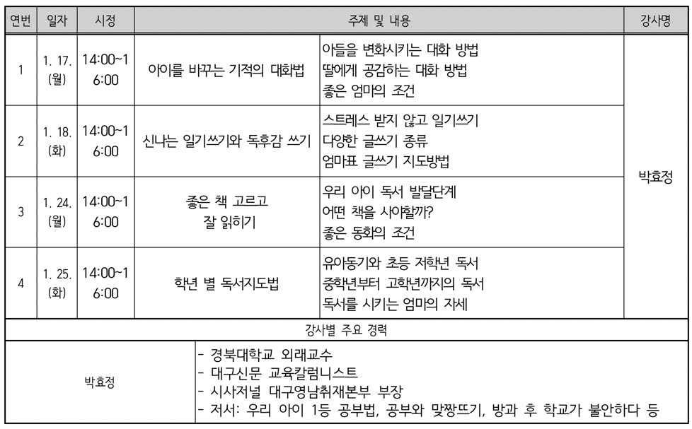 1월17일(월) ▲아이를 바꾸는 기적의 대화법을 시작으로 18일(화) ▲신나는 일기쓰기와 독후감 쓰기, 24일(월) ▲좋은 책 고르고 잘 읽히기, 25일(화) ▲학년별 독서지도법 순으로 프로그램이 구성되며, 화상회의 프로그램인 줌(Zoom)을 활용하여 대구신문 교육칼럼니스트이자 시사저널 대구영남취재본부 부장으로 활동하고 있는 박효정 강사의 진행으로 실시간 쌍방향 소통으로 실시된다.