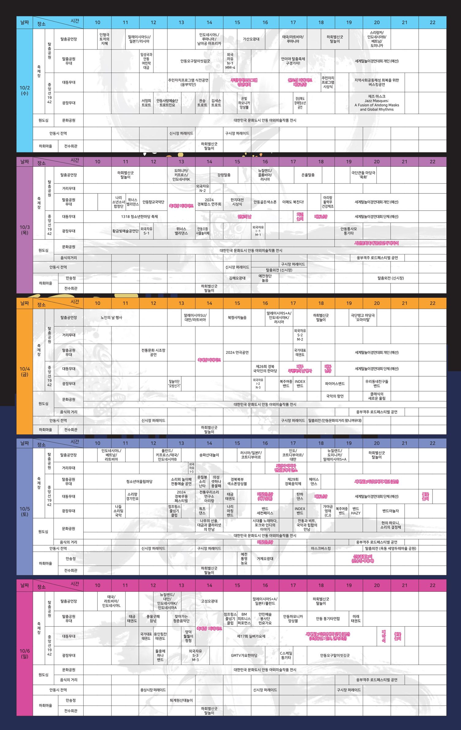 10월 4일에는 페루를 주빈국으로 한 특별 행사가 진행된다. 페루 쿠스코시와 주한 페루 대사의 참석으로 한층 더 의미를 더할 이번 행사는 양국의 전통 공연과 문화 교류 세레모니로 구성된다. 특히 K-POP과 케추아어의 융합을 선보이는 페루의 ‘Q-POP’ 가수 레닌타마요의 내한 공연이 주목받고 있다. 페루의 다양한 문화와 관광을 홍보하는 체험행사와 전시도 축제 기간 내내 운영될 예정이다.