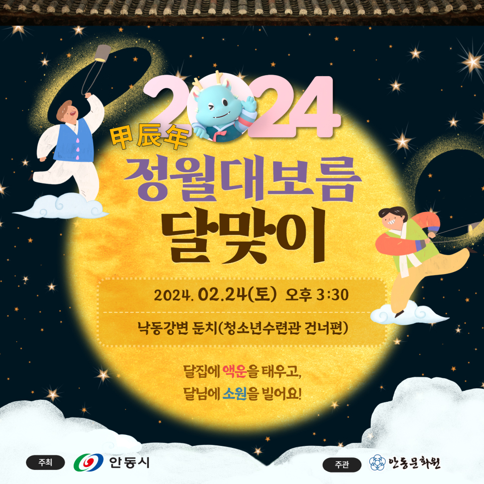 갑진년 새해를 맞아 안동시민의 안녕과 평안을 기원하는 2024년 정월대보름 달맞이 행사가 오는 24일 안동문화예술의전당 맞은편 강변둔치에서 개최된다.