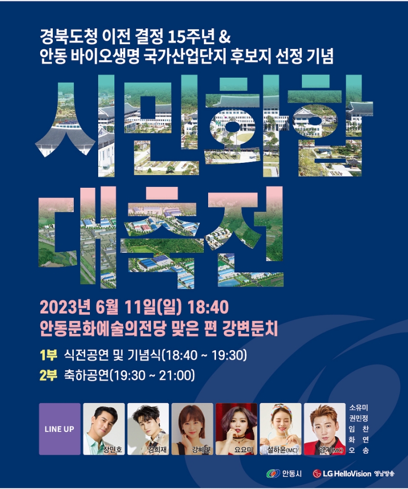안동 100년 발전의 초석이 될 도청 이전 결정과 국가산업단지 후보지 선정의 의미를 되새기며 시민 모두가 함께 즐기는 축하의 장을 연다. 특히, LG헬로비전의 ‘헬로 콘서트 좋은 날’ 녹화와 연계해 장민호, 김희재 등 정상급 가수들이 대거 출연해 흥겨운 무대를 선사할 예정이다.