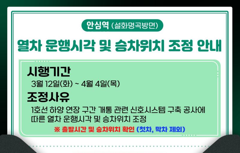 대구교통공사는 1호선 하양 연장(안심~하양) 개통과 관련해 오는 3월 12일(화)부터 안심역에서 하양 연장 구간 신호시스템 구축을 위한 공사를 시행함에 따라 안심역 출발 열차 운행시각과 승차위치가 변경된다고 밝혔다.