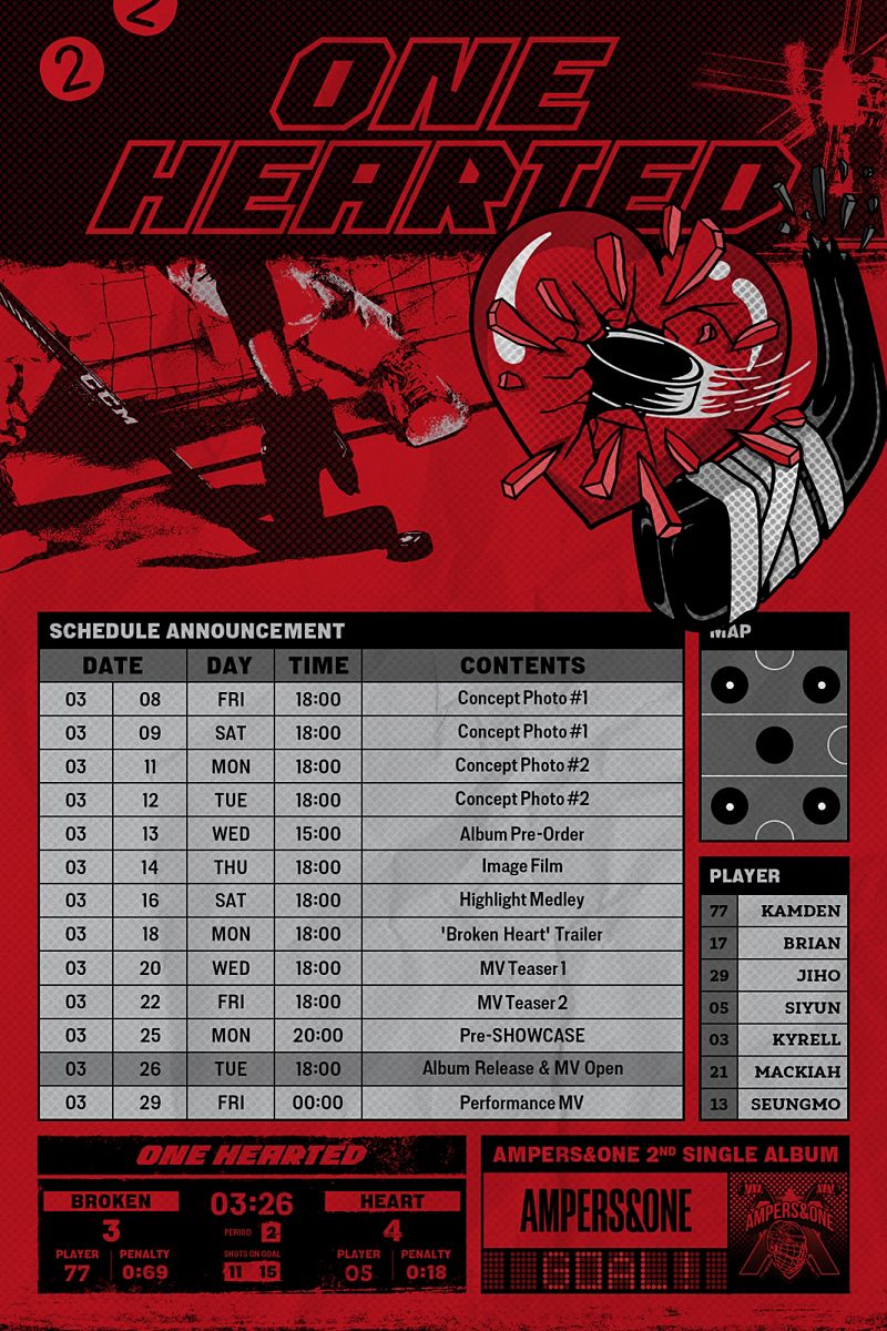 앰퍼샌드원의 소속사 FNC엔터테인먼트는 7일 앰퍼샌드원 공식 SNS를 통해 오는 3월 26일 발매하는 두 번째 싱글 앨범 ‘ONE HEARTED’(원 하티드)의 트랙리스트와 플랜포스터를 공개했다.