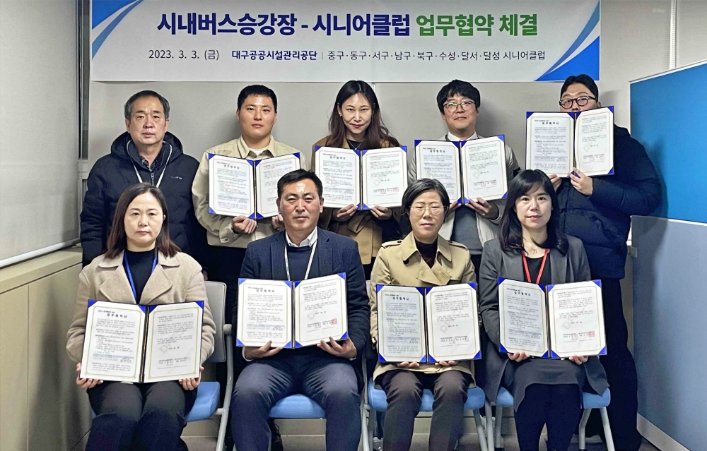 대구공공시설관리공단은 3월 3일(금) 버스 승강장 환경정화 활동 및 어르신 일자리 창출을 위해 대구시 7개 구·군 시니어클럽과 ‘2023년 버스승강장 도우미사업 업무협약’을 체결했다.
