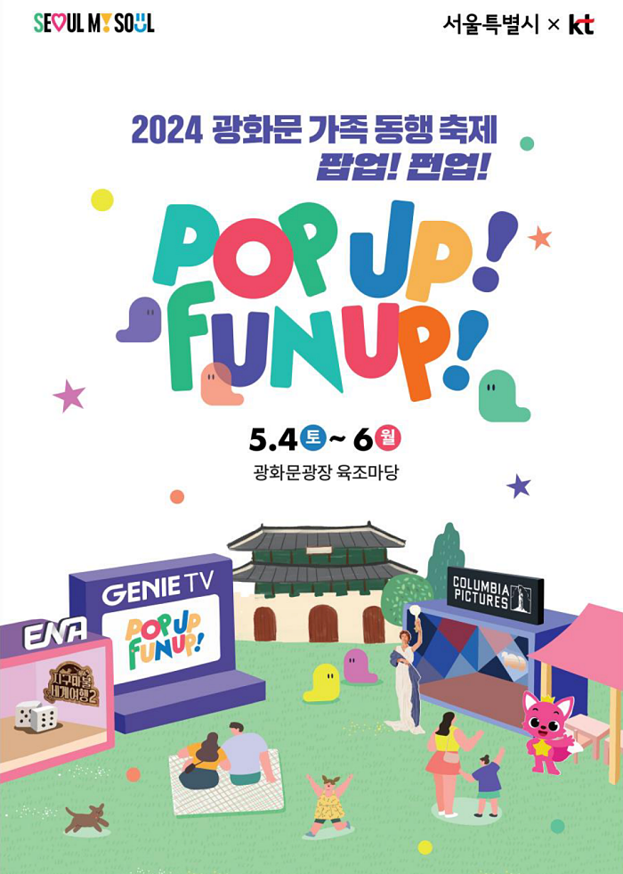 서울시는 가정의 달을 맞아, 지니 TV(KT)와 함께 온 가족이 즐길 수 있는 [2024 광화문 가족 동행 축제 ‘팝업! 펀업!’]을 개최한다고 밝혔다. 5월 4일부터 6일까지 매일, 오전 11시부터 오후 5시까지 운영하며, 대상을 가족으로 확대해 더욱 풍성한 볼거리와 이벤트를 준비했다.