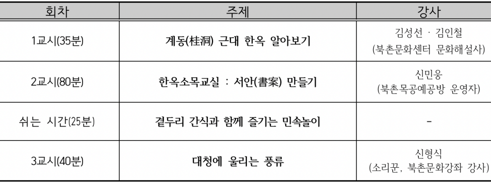 '계동(桂洞) 근대한옥'에 대해 알아보는 1교시는 북촌문화센터 전문 해설사와 함께 사랑방, 대청마루 등 여름 정취가 깃든 한옥을 구석구석 살펴보며 전통 생활문화에 대해 알아본다. 특히 사랑방은 전통가구를 재현하여 쉽고 생생한 이해를 도울 예정이다.