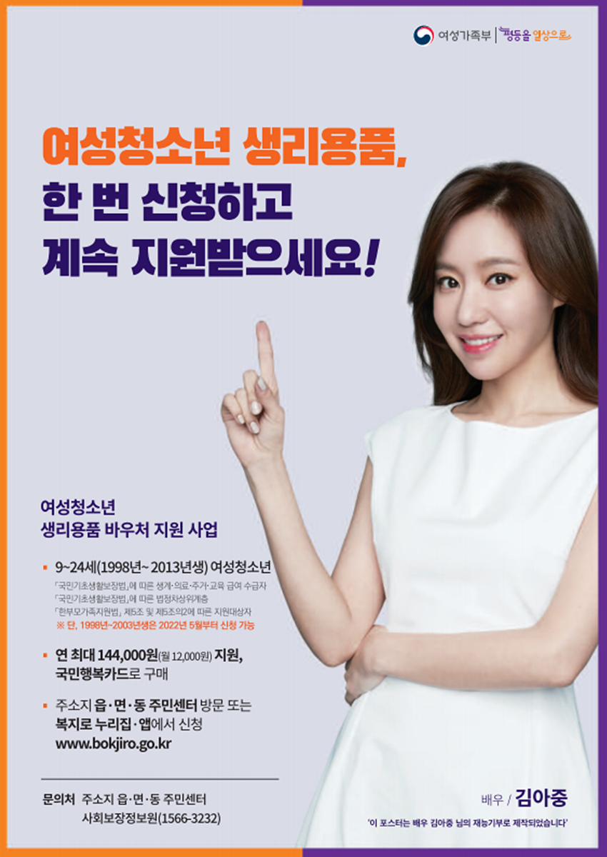 지원 연령은 기존 만 11세 ~ 만18세에서, 만9세~만24세(98년생~13년생)로 확대됐으며, 이는 성조숙증으로 인해 초경 연령대가 낮아진 점을 반영했다. 지원 대상은 생계·의료·주거·교육 급여 수급자와 법정 차상위계층, 한부모가족지원법에 따른 지원 대상자이다.