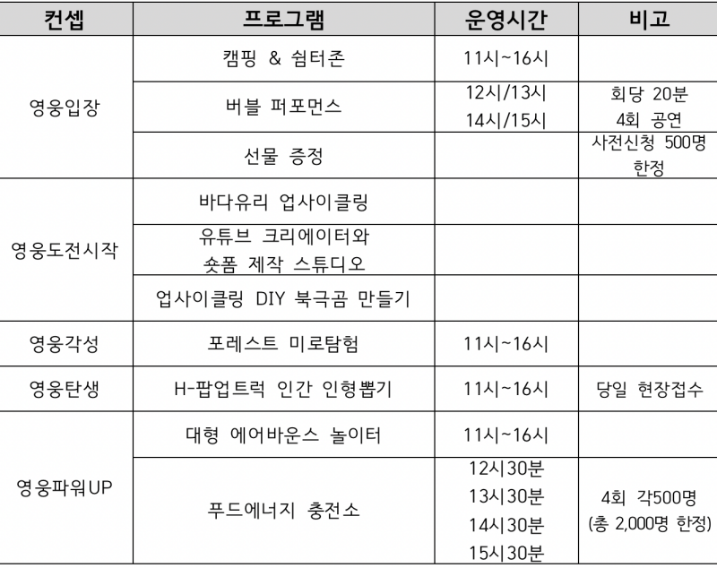 ‘지구를 지키는 놀이터’는 기후변화에 맞서 지구를 지키는 영웅들의 활약을 담은 5개 컨셉(▴오늘의 영웅 입장, ▴영웅 도전 시작, ▴영웅 각성, ▴영웅 탄생, ▴영웅 파워 UP)으로, 공연, 각종 체험 프로그램 등 다양하고 특색있는 놀거리로 구성된다. 이날 하루, 현장을 찾는 어린이 누구나 기후변화에 맞서 지구를 지키는 영웅이 된다.