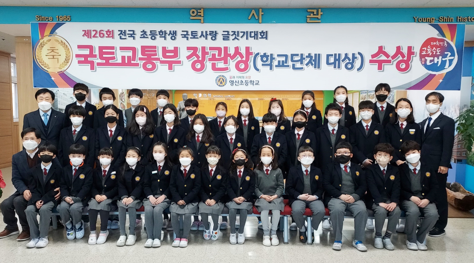 영신초등학교는 작년에 이어 올해에도 국토연구원과 EBS가 주최한 제26회 전국 초등학교 국토사랑 글짓기대회에서 단체부문 대상으로 국토교통부장관상을 받았다고 23일 전했다.