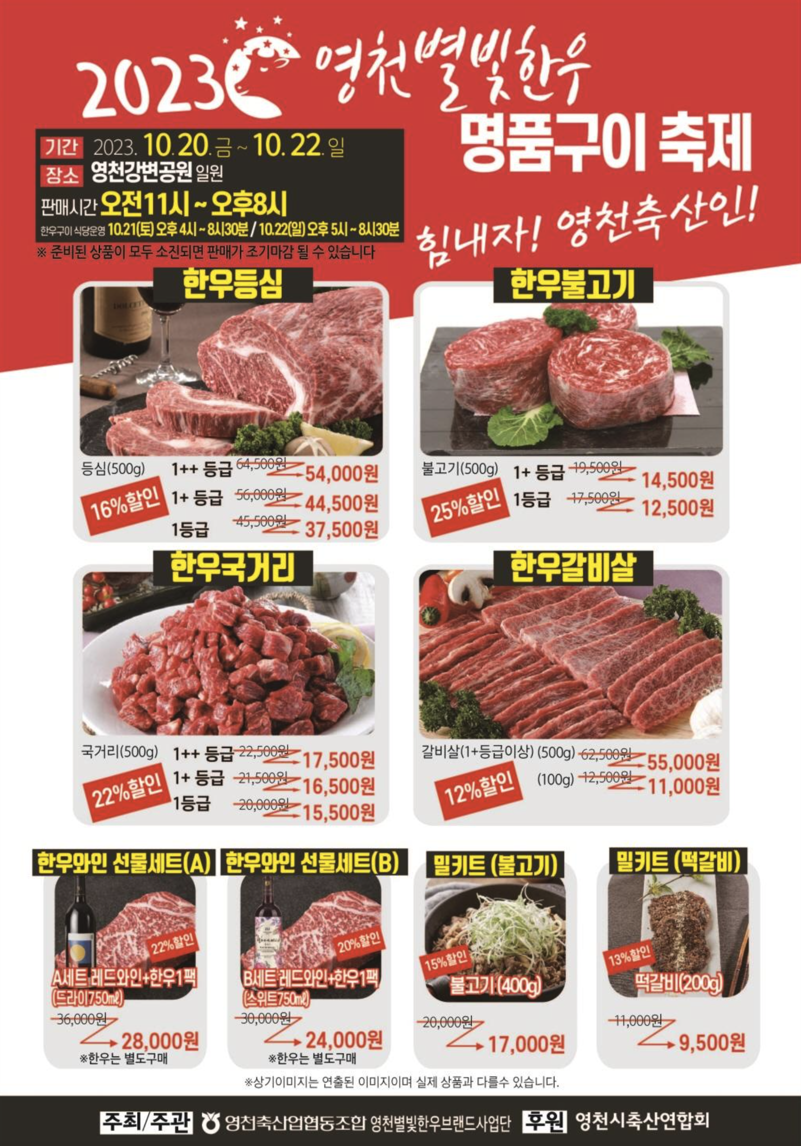 축제 3일동안 오전 11시부터 영천별빛한우를 12~25% 할인 판매하며, 첫 선을 보이는 와인·한우 선물세트(드라이, 스위트)와 밀키트(떡갈비, 불고기)도 13~22% 할인된 가격에 구매할 수 있다.