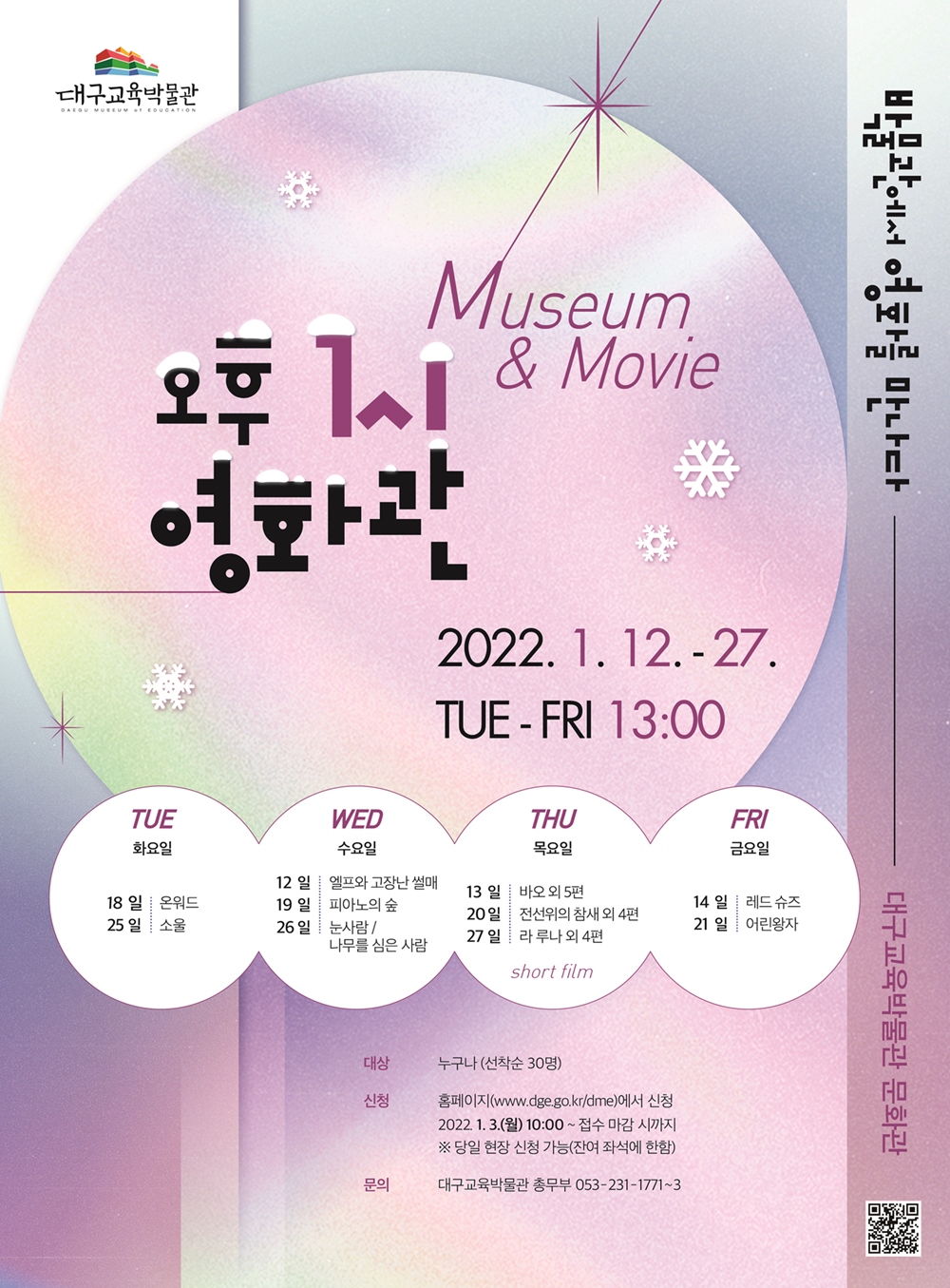 대구교육박물관은 겨울방학을 맞은 어린이와 청소년들을 위한 특별 프로그램으로 ‘오후 1시 영화관’을 운영한다.
