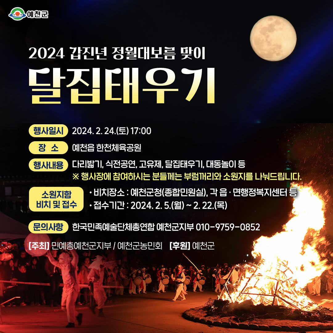 예천군은 2024 갑진년 정월대보름 달집태우기 행사를 오는 24일(토) 17시부터 예천읍 한천체육공원에서 개최한다고 밝혔다.
