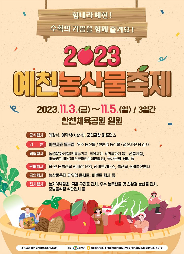 예천군(군수 김학동)은 11월 3일부터 5일까지 3일간 한천체육공원 일원에서 ‘2023 예천농산물축제’를 개최한다.
