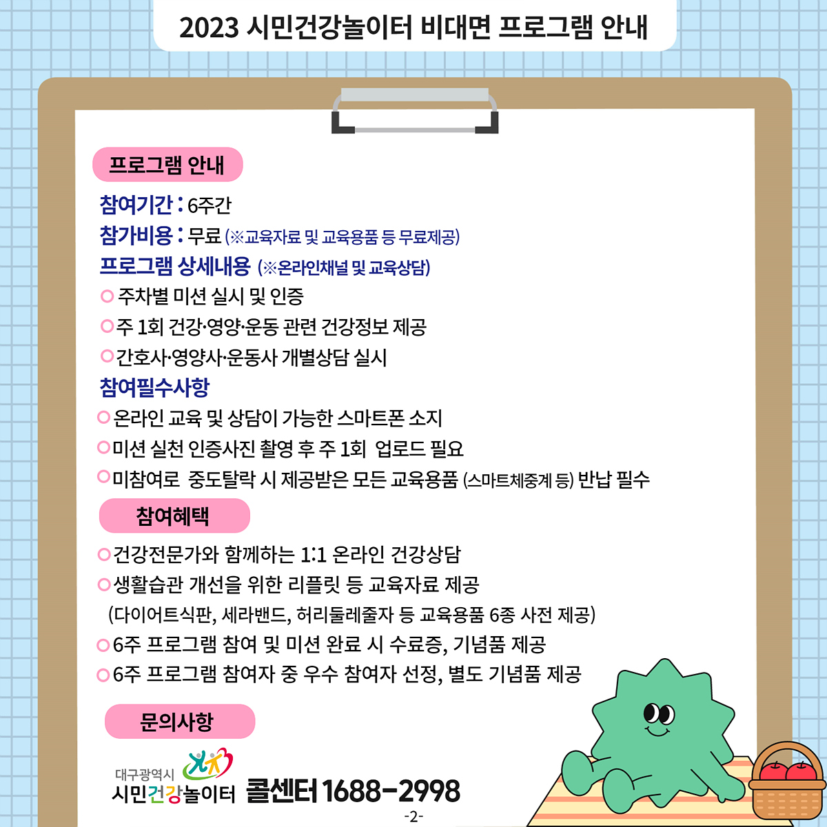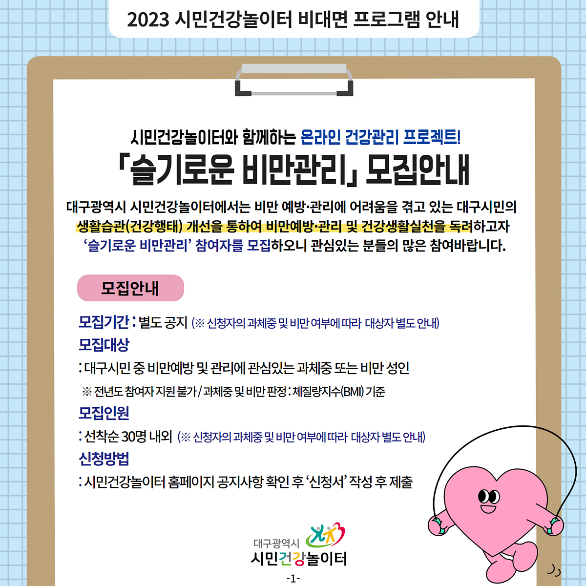 대구광역시 시민건강놀이터에서는 온라인 건강증진 프로그램 ‘슬기로운 비만관리’를 올해 7월까지 총 10회에 걸쳐 운영했다. 코로나19 펜데믹으로 대면방식의 건강서비스가 불가했던 2020년에 첫 시범운영 후 현재까지 지속 중이다.