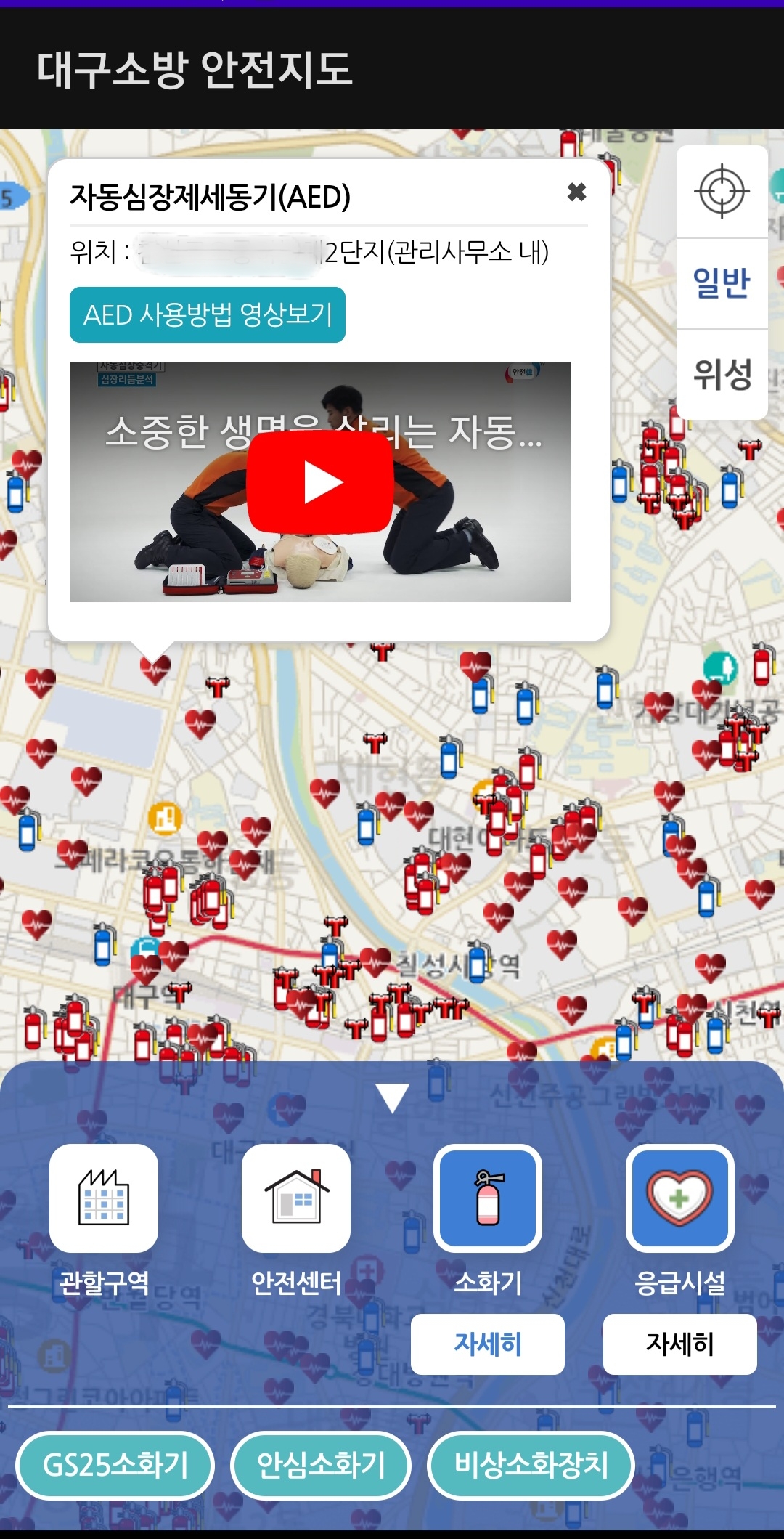 지도에 표시된 도구를 클릭하면 설치된 상세 위치와 긴급할 때 당황하지 않고 활용할 수 있도록 사용 방법을 동영상으로 확인할 수 있다.