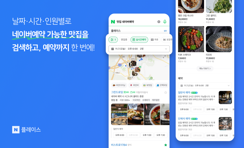 먼저, 네이버와 네이버 지도 검색 결과에 ‘실시간 예약’ 기능을 반영했다. ‘맛집 네이버예약’, ‘20명 회식 맛집 네이버예약’과 같은 키워드를 검색하면 실시간 예약 기능을 통해 원하는 가게를 손쉽게 찾아 예약할 수 있다. 실시간 예약 필터에서 ▲날짜 ▲시간 ▲인원 수 등을 선택하면, 네이버예약을 지원하는 음식점 중 조건에 맞는 음식점을 한번에 모아볼 수 있다. 기존처럼 개별 음식점의 플레이스 페이지에서 원하는 일정에 예약할 수 있는지 등을 일일이 확인하지 않아도, 조건에 맞는 가게들을 간편하게 탐색 가능하다.